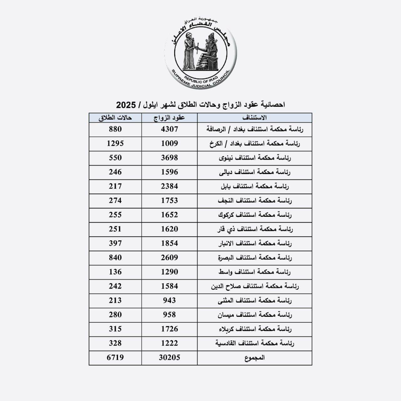 احصائية الزواج والطلاق لشهر ايلول لسنة 2025