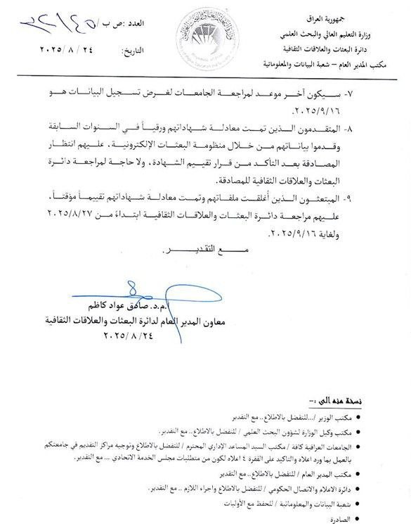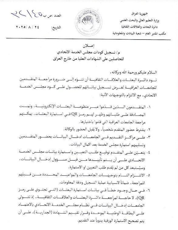 التعليم تنوه بشأن تسجيل كودات مجلس الخدمة للحاصلين على الشهادات العليا من خارج العراق وتحدد آخر موعد لتسجيل البيانات
