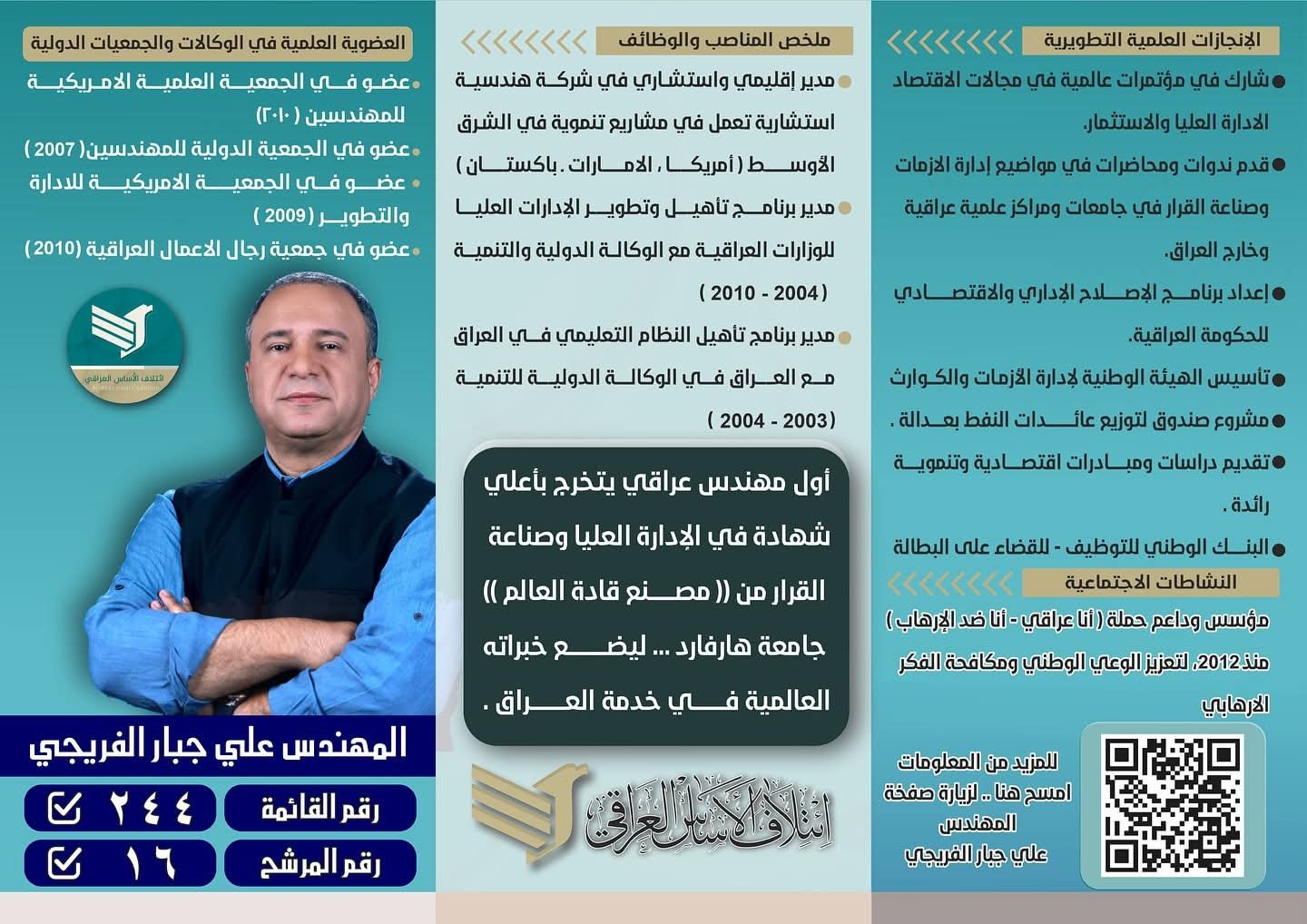 اللافت في هذه التجربة أن تطبيقات الذكاء الاصطناعي في تحليل الخطاب الانتخابي أظهرت شخصية عراقية متميزة، تمثلت في المهندس علي جبار الفريجي، مرشّح ائتلاف الأساس العراقي – بغداد، والذي برز ضمن النتائج كنموذج استثنائي يجمع بين الكفاءة الأكاديمية العالية وخبرة إدارة الأزمات بأسلوبٍ علميٍّ حديث.